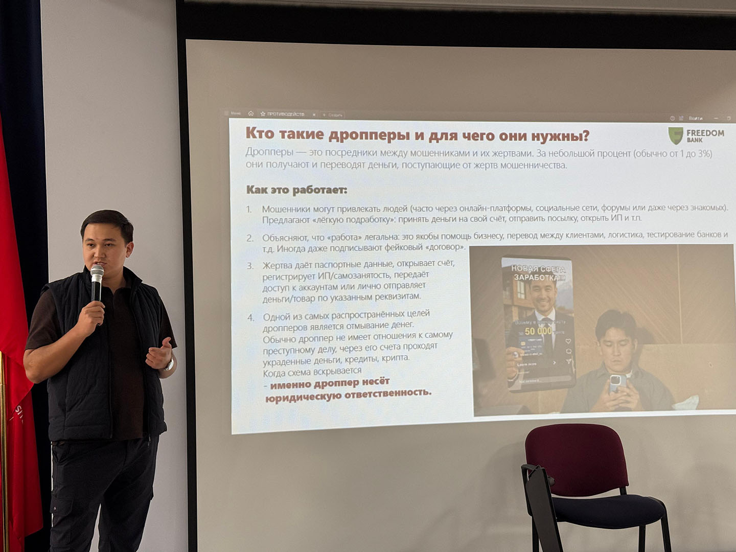 «Фридом банк» АҚ өкілі Бағдат Сағынбеков, Қазақстан Республикасы Қаржы нарығын реттеу және дамыту агенттігінің сарапшысы Д.И. Акмаев, Алматы қаласының Полиция департаментінің қызметкері Б.А. Расылхан спикерлер ретінде сөз сөйледі.